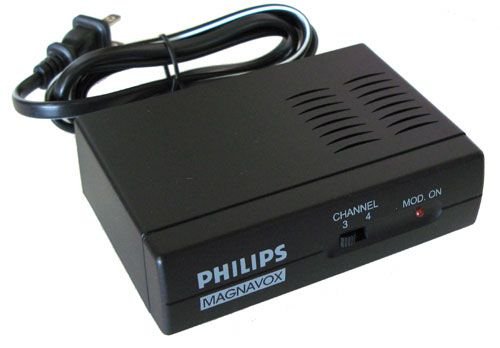 Philips / Magnavox #PM61138. Allows connection of video cameras and devices, games and DVD players to TVs with F-connector input. This applies to most older model, and some newer TVs. Automatically switches from TV to connected component when power for that component is turned on. Selectable channel 3 or 4 output. UL.